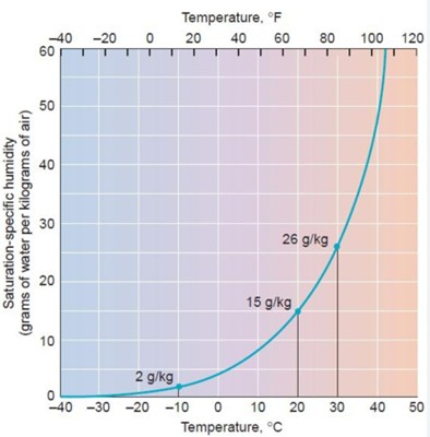 Mientras la concentración de vapor de agua esté por debajo de la cantidad crítica de la mezcla de vapor y aire seco correspondiente a la masa de aire, el vapor no condensa y no llueve. Si el aire, por ejemplo, con 25 g/kg a 32ºC se enfría bruscamente hasta, digamos, 0ºC al encontrar una masa de aire frío por encima, se produce la tormenta y la inundación.